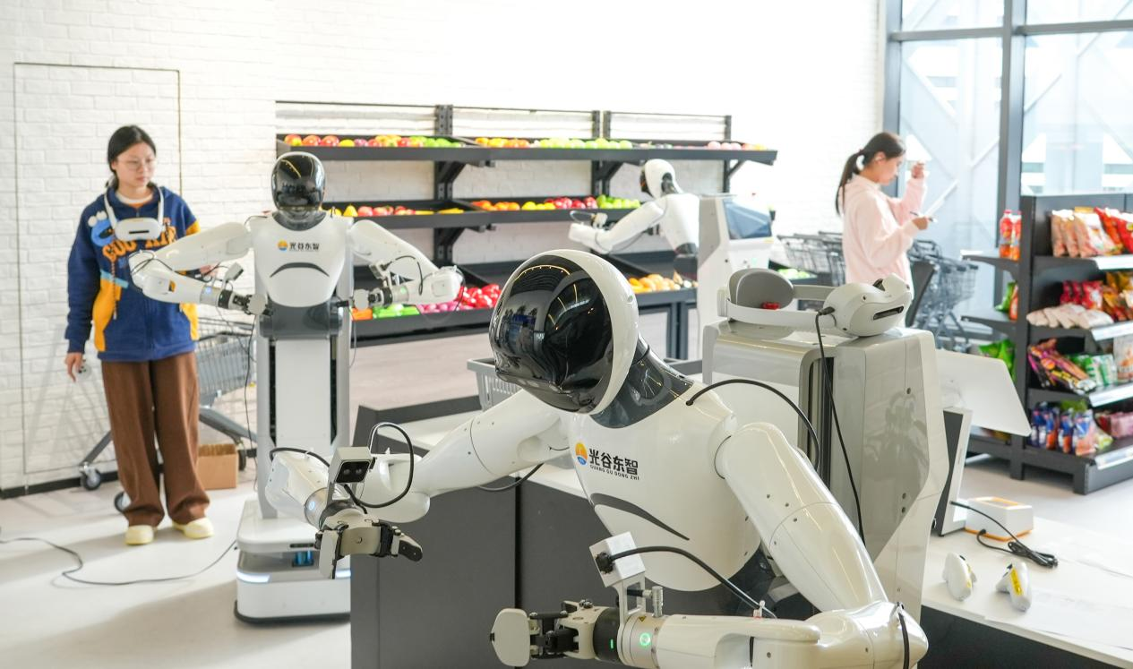 人形机器人在超市零售场景下进行训练(央广网记者 邓子依摄)