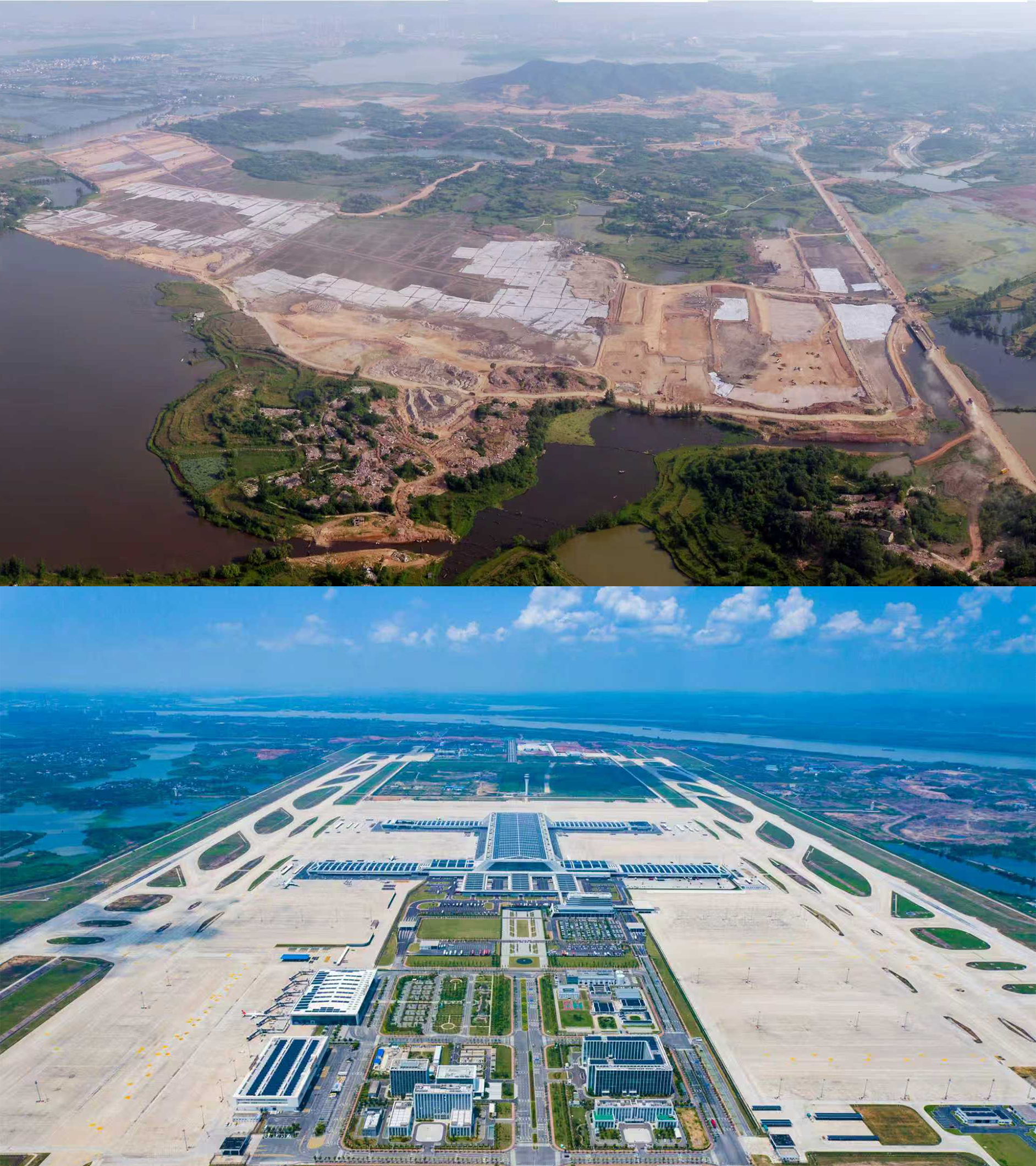 2019年还是一块工地的鄂州花湖国际机场,如今已成为通达世界的航空货运枢纽(央广网发 上图鄂州花湖国际机场供图;下图任勇摄)