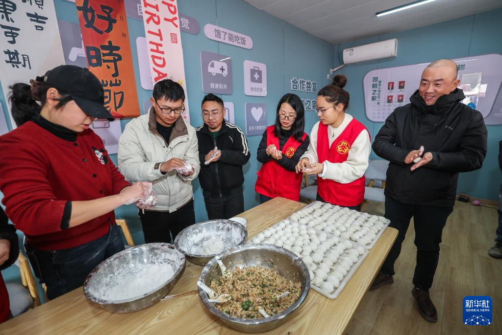 2月9日,在建德市更楼街道司机之家,志愿者和货车司机们一起包汤圆。