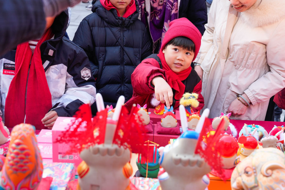 小朋友被北京非遗IP兔儿爷泥塑吸引。
