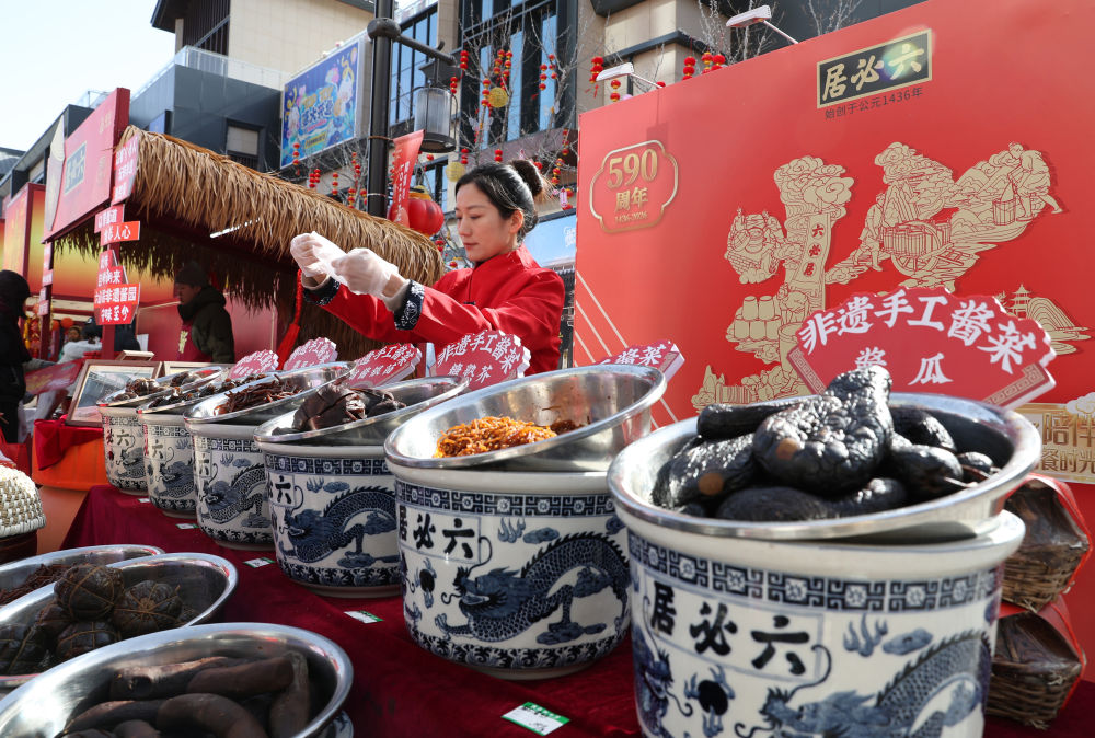 商家在为顾客打包非遗手工酱菜。