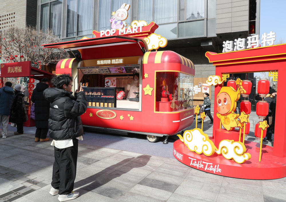 游客在泡泡玛特甜品屋前拍照。