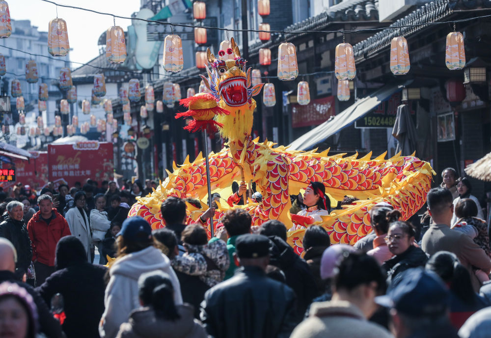 2026年2月8日,游客在浙江寿昌古镇老街上观看传统舞龙表演。近期,浙江省建德市寿昌古镇举办传统民俗迎新春活动,民俗踩街、舞龙舞狮、马年主题灯展等活动,吸引八方游客前来体验古镇传统年味,进一步激活新春消费市场,为当地文旅经济发展注入新动能。