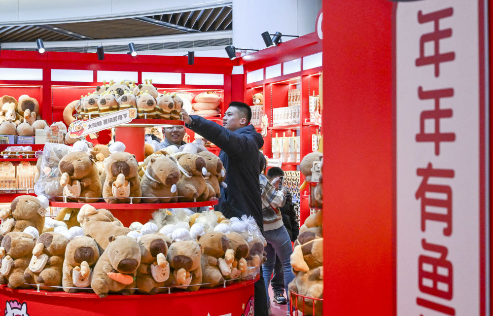 2026年2月7日,市民游客在上海市南京路步行街一家春节限定潮玩快闪店挑选商品。