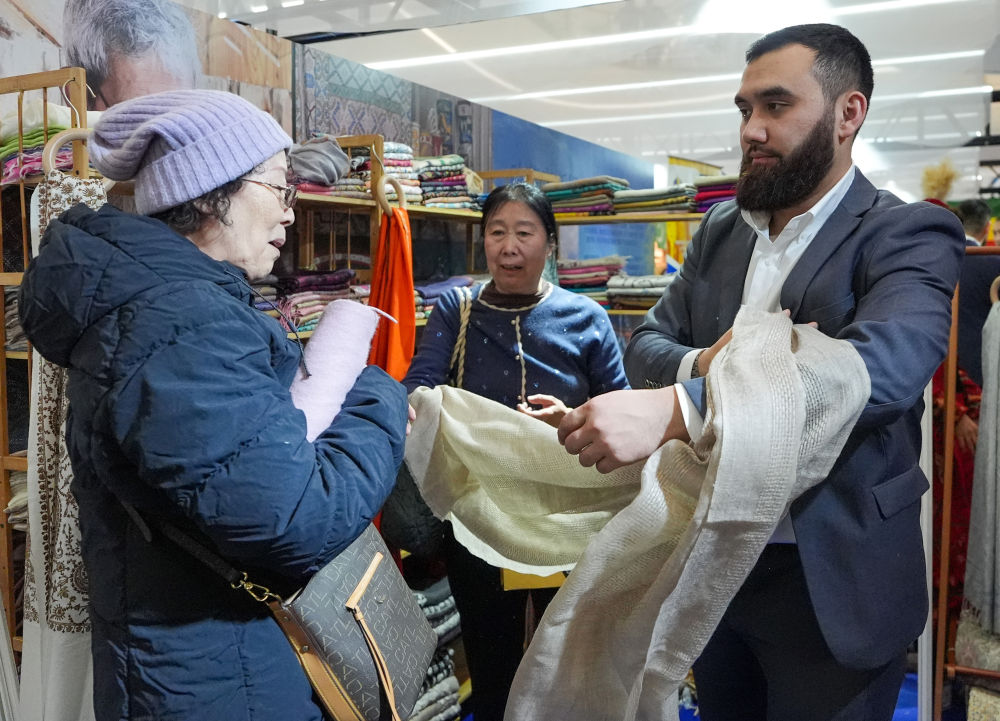 2026年2月4日,在“共享大市场·出口中国”2026年首场活动暨北京国际精品荟的进口商品推介区,参观者(左)购买展出的乌兹别克斯坦围巾。当日,“共享大市场·出口中国”2026年首场活动暨北京国际精品荟启动活动在湾里·王府井WellTown举行,现场打造了“一站式”全球好物采购展区,为市民新春消费注入活力。