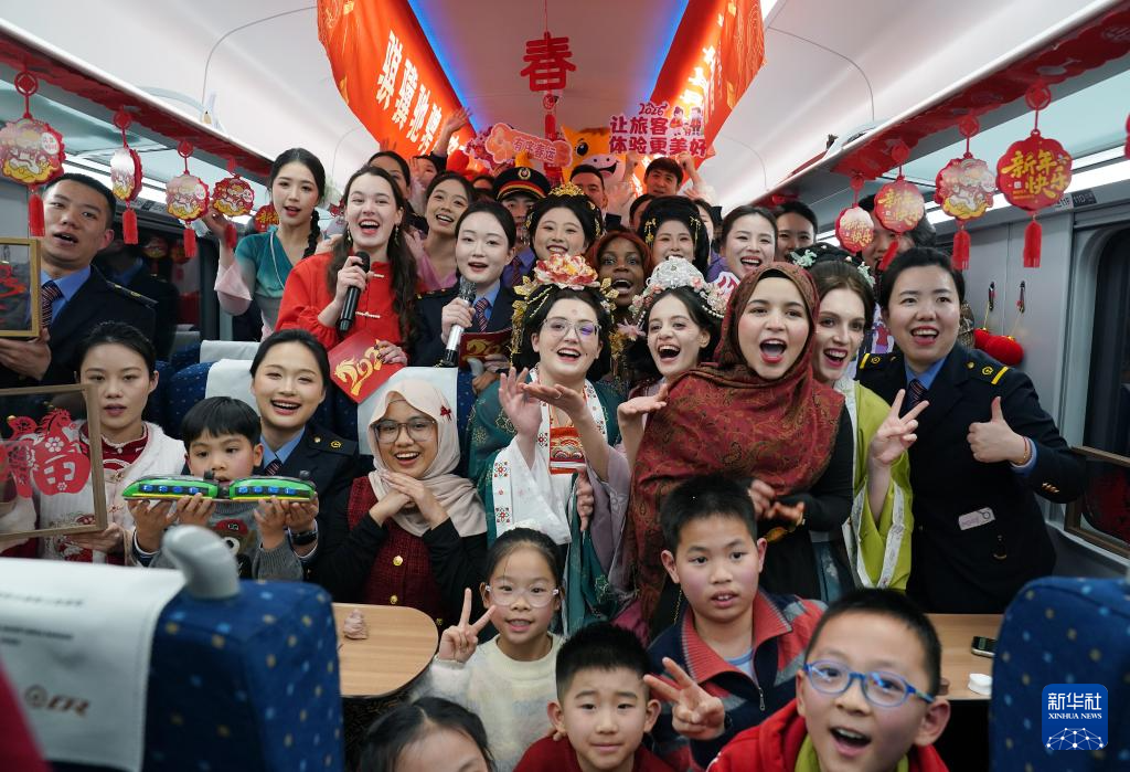 2月10日,参加演出的外国留学生与小旅客在列车内招手。