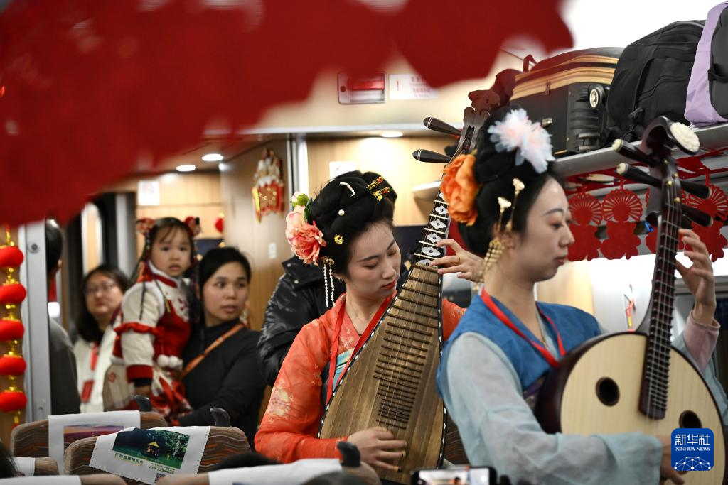 2月10日,来自西安市总工会“工会文艺轻骑兵”的演员在D1925次免费爱心专列上为返乡务工人员表演。