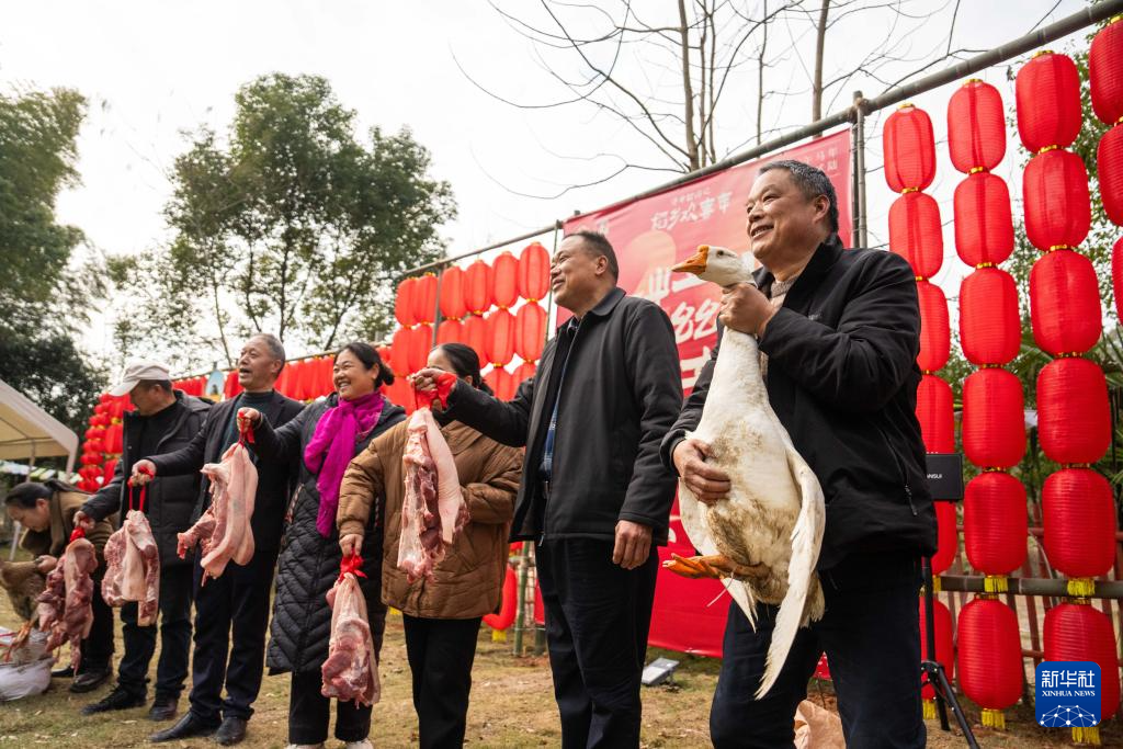 2月10日,在谢家铺镇港中坪村,村民领取打糍粑大赛的奖品。