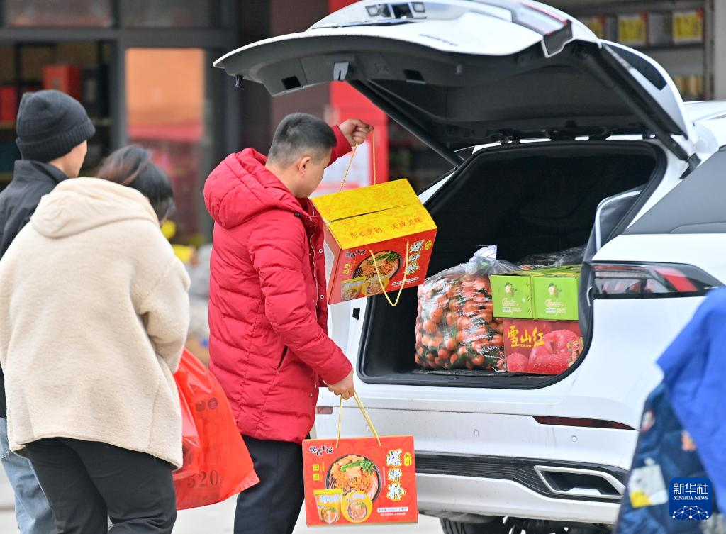 2月11日,在柳州市柳南区瑞龙路一家农产品批发市场,市民将年货搬上车。