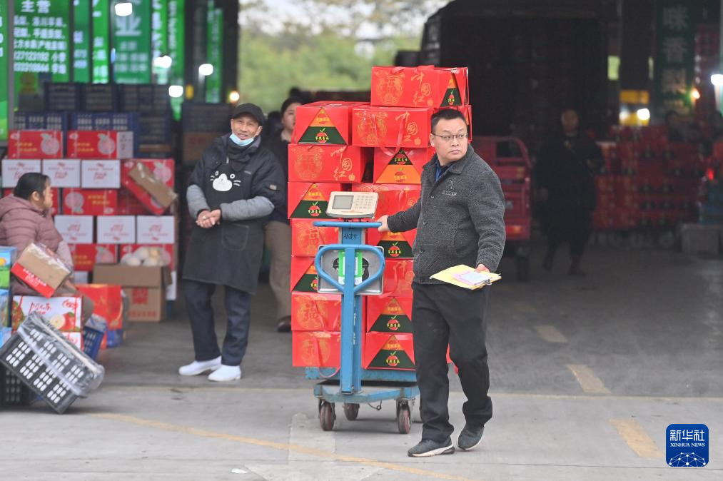2月11日,在柳州市柳南区瑞龙路一家农产品批发市场,商家在搬运水果。