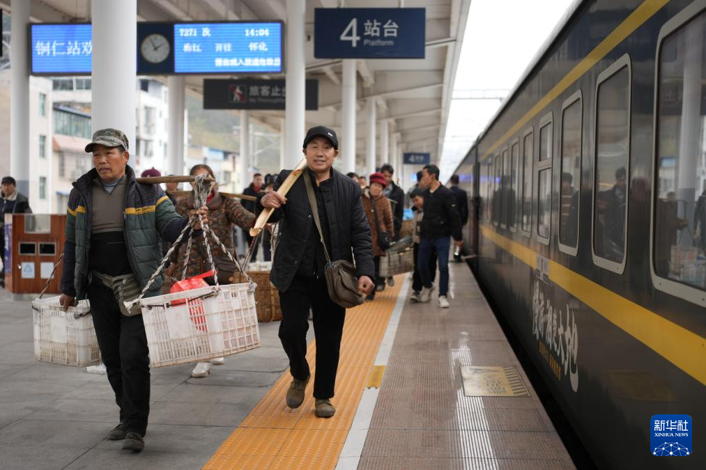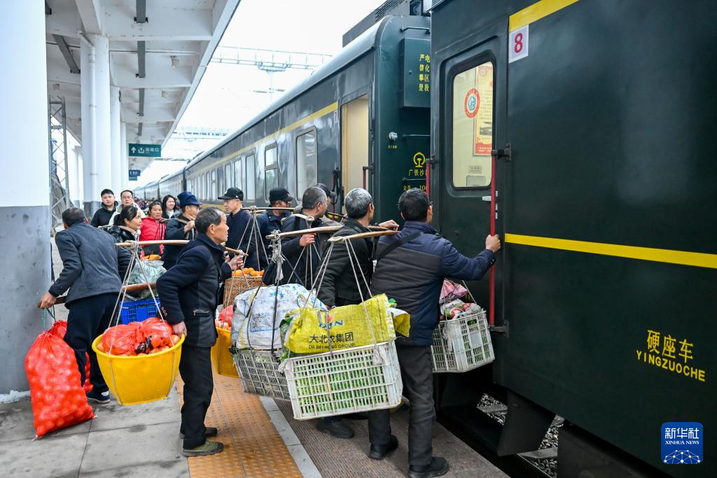 2月12日,村民挑着新鲜果蔬准备搭乘7272次公益性“慢火车”前往贵州铜仁。