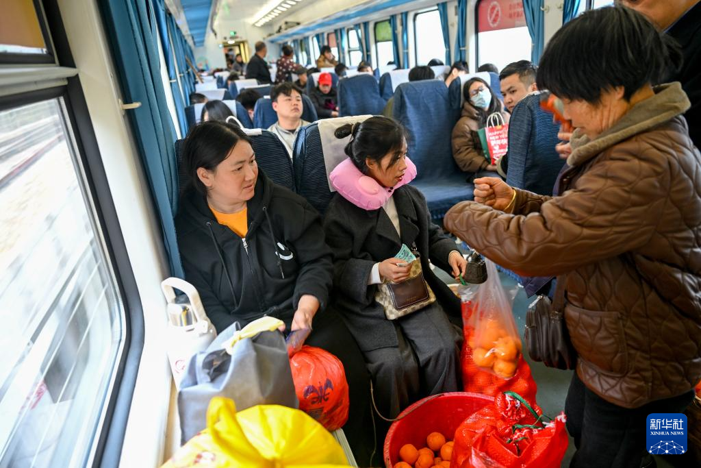 2月12日,在7272次列车车厢内,来自湖南的村民(右)和乘客进行交易。