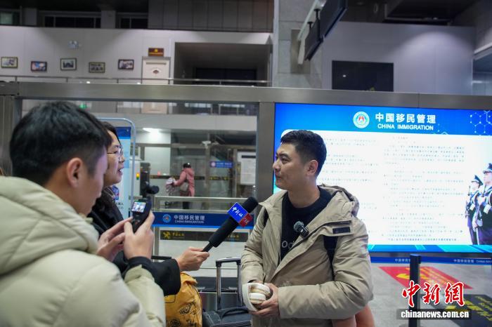 图为中国旅客朱良东从友谊关口岸入境后接受中新网记者采访。陈冠言摄