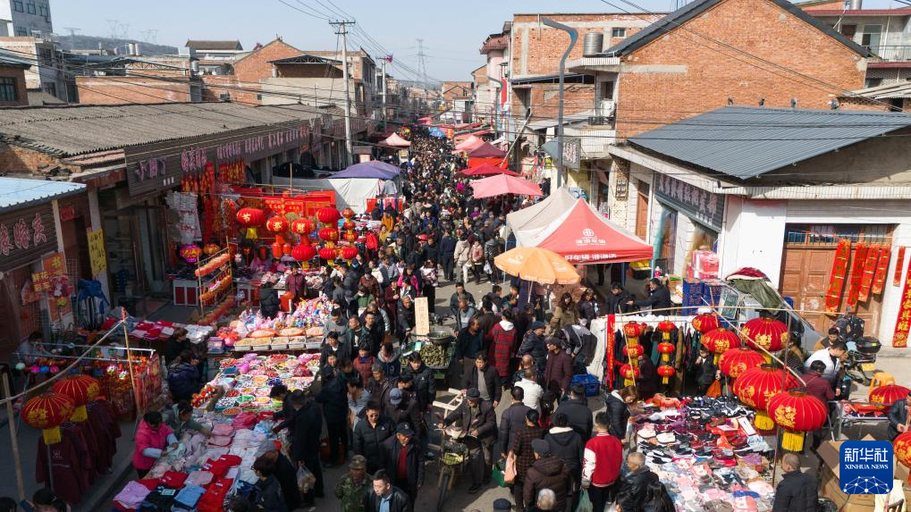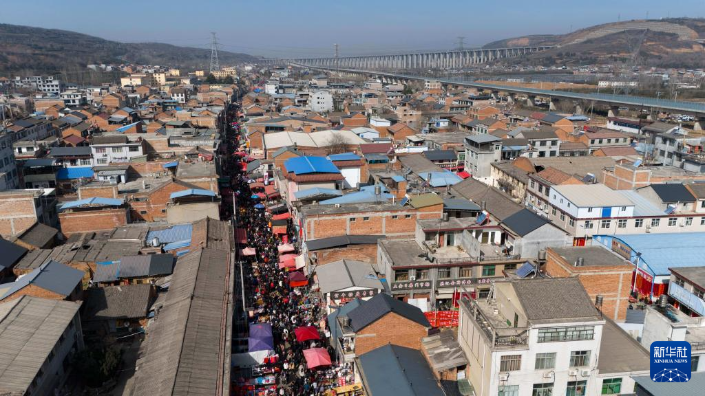 2月13日,游客在焦岱大集上赶集购物(无人机照片)。