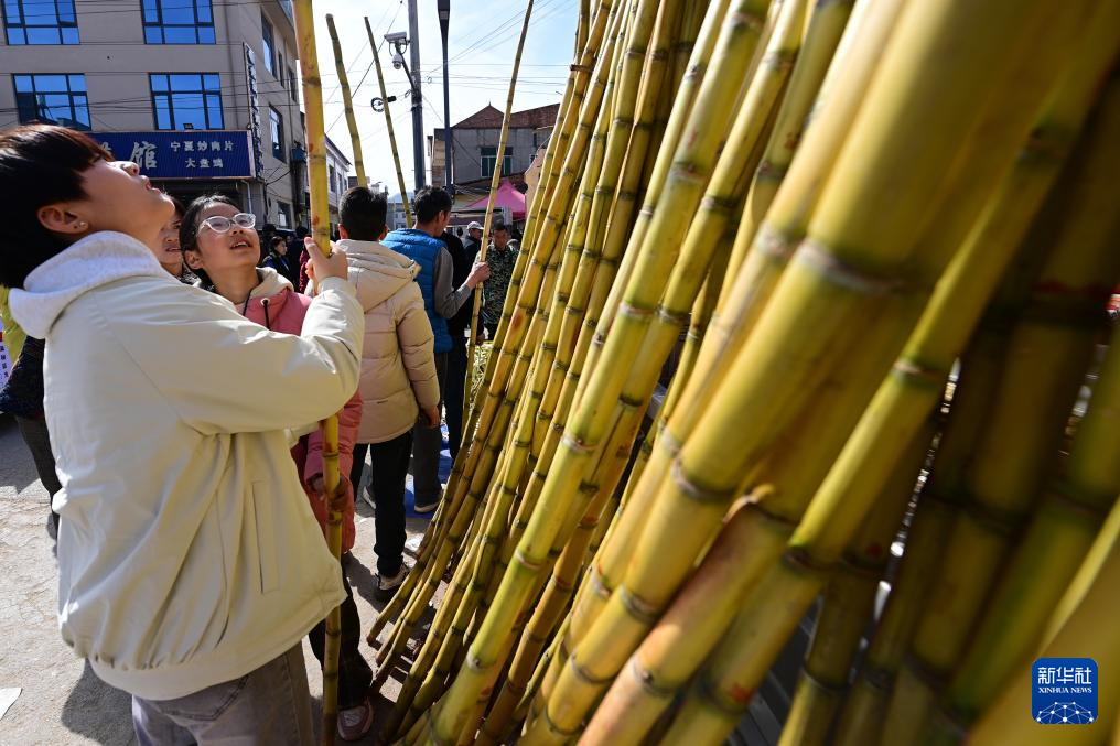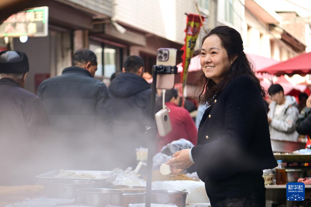 2月13日,游客在焦岱大集上观看糍粑制作。