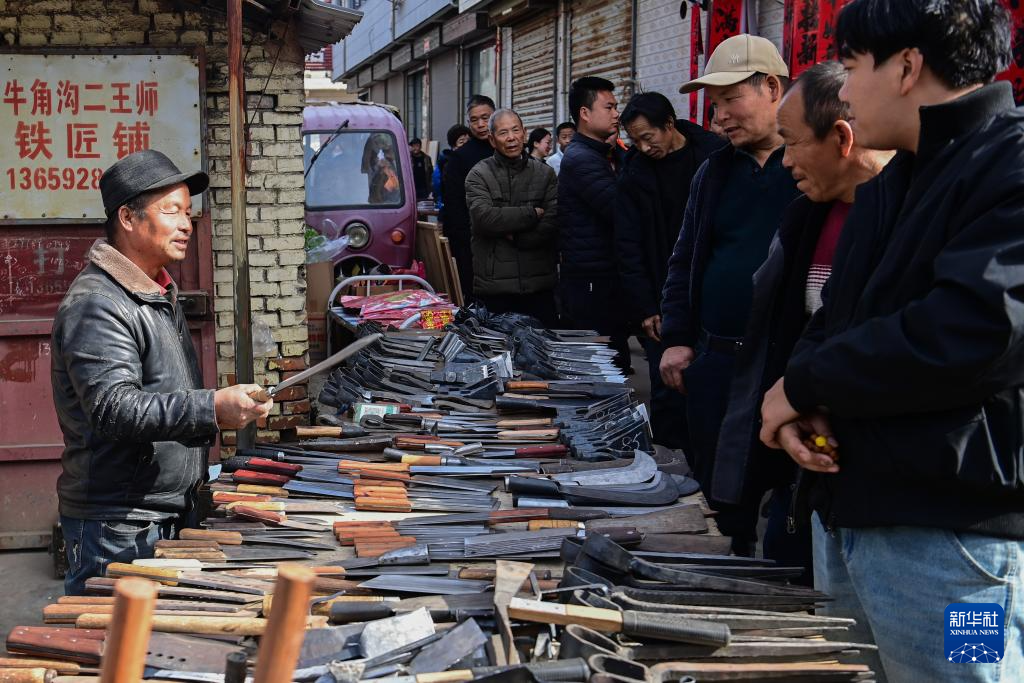 2月13日,当地手工艺人李学员(左二)在焦岱大集上向顾客介绍自制的手工凳子。