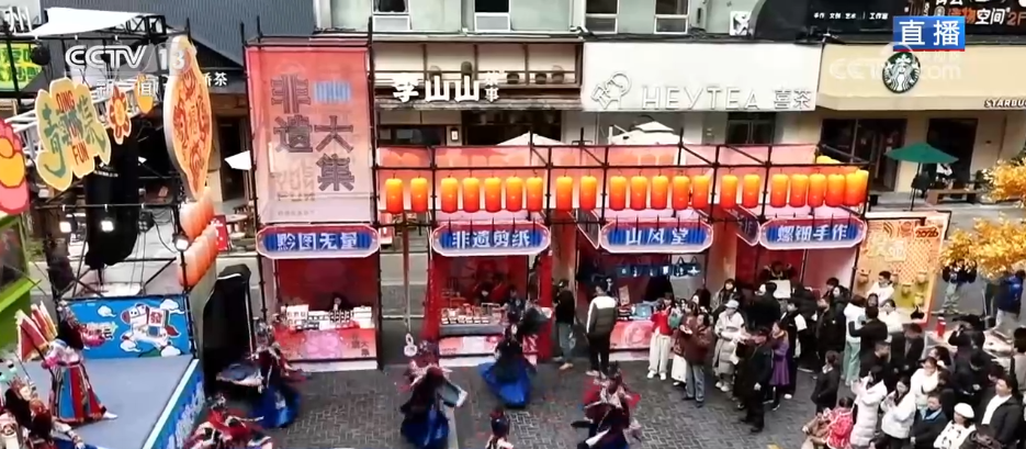 记者来到贵阳市的青云市集,通过航拍镜头可以看到,这里是在贵阳老城区的中心位置。最近几年,贵阳市通过城市更新,把这里改造成了这几年火爆出圈的文旅街区。现在,听见鼓声响起,青云市集为了迎新春而专门打造的“非遗集市”正式开市了,台上正在表演的是贵州省级非物质文化遗产——石阡傩戏。