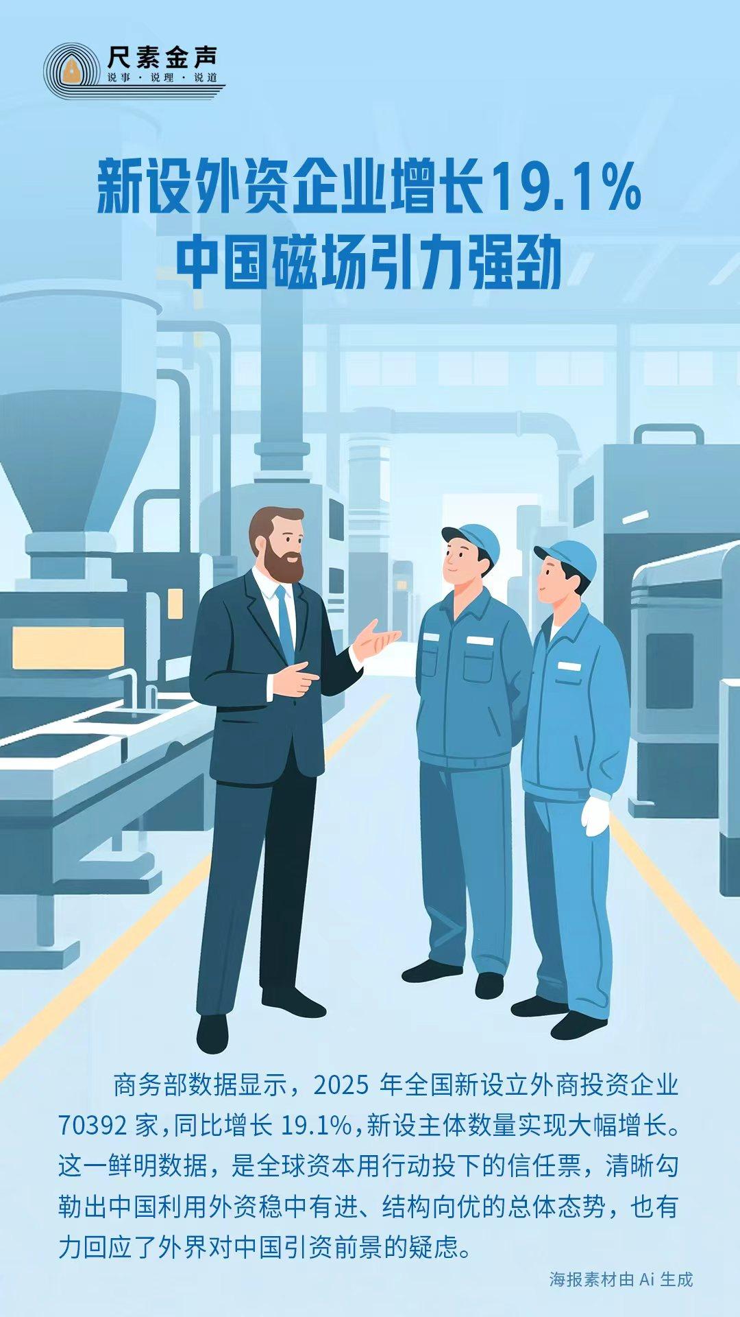 商务部数据显示,2025年全国新设立外商投资企业70392家,同比增长19.1%,新设主体数量实现大幅增长。这一鲜明数据,是全球资本用行动投下的信任票,清晰勾勒出中国利用外资稳中有进、结构向优的总体态势,也有力回应了外界对中国引资前景的疑虑。