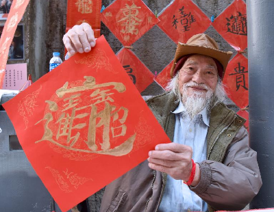2月13日,在香港楼梯街,郭腾龙展示自创的合体字挥春。