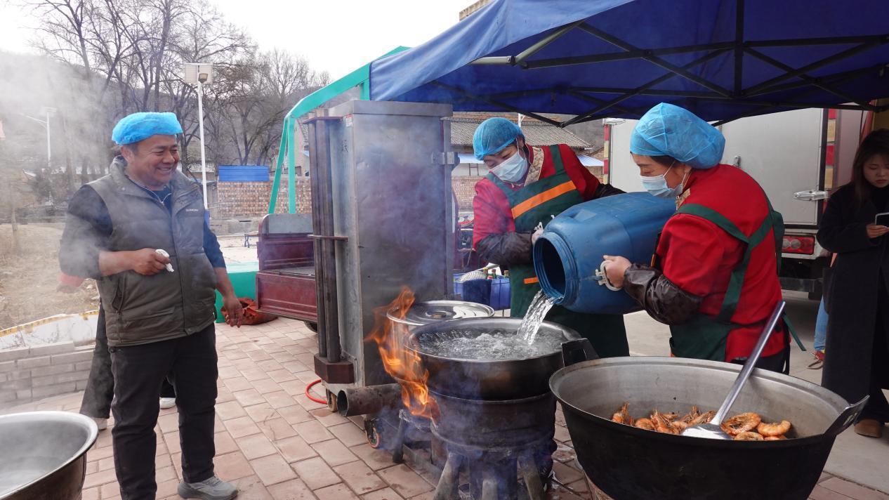 大家一起动手,不到半小时,一个大约一百平方米的移动帐篷宴会厅平地而起,配套的桌椅、桌布、取暖设备和照明电灯等一样不少。锅灶、煤气炉、蒸箱一字排开,就在帐篷门口,真正“明厨亮灶”。备好了大件,大家开始洗青菜、择菜,这些当天现弄才新鲜。