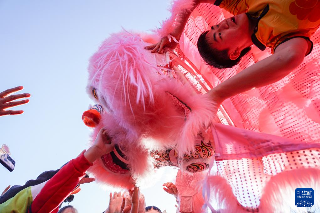 2月17日拍摄的东岳庙庙会中的狮舞演出。