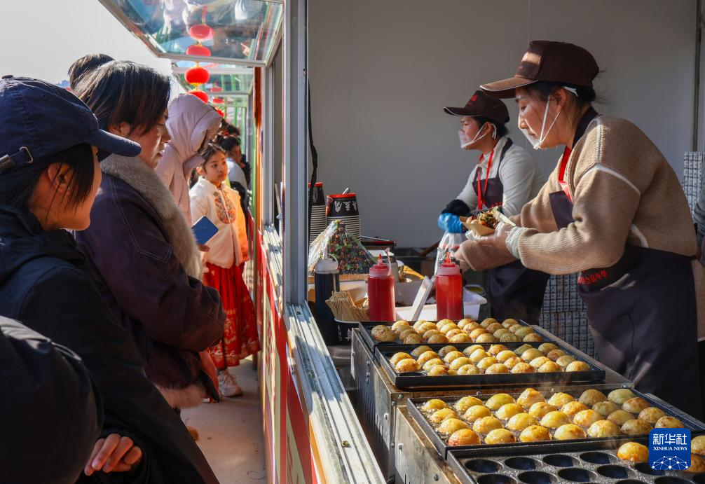 2月18日,在江苏省兴化市莲溪湖公园,市民和游客在特色小吃市集选购、品尝特色小吃。
