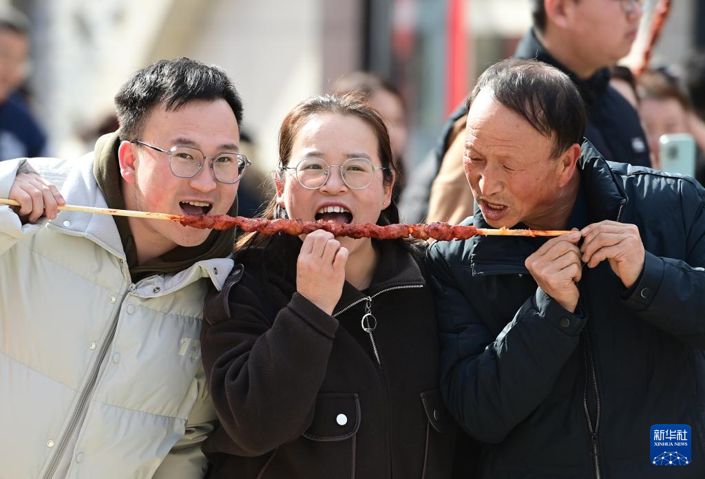 2月18日,在陕西延安的金延安街区,游客在品尝大串烤肉。