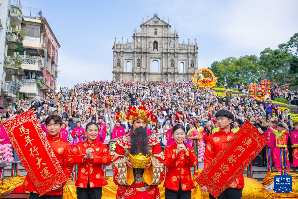 2月18日,“财神爷”(中)在澳门大三巴牌坊前向市民及游客拜年。