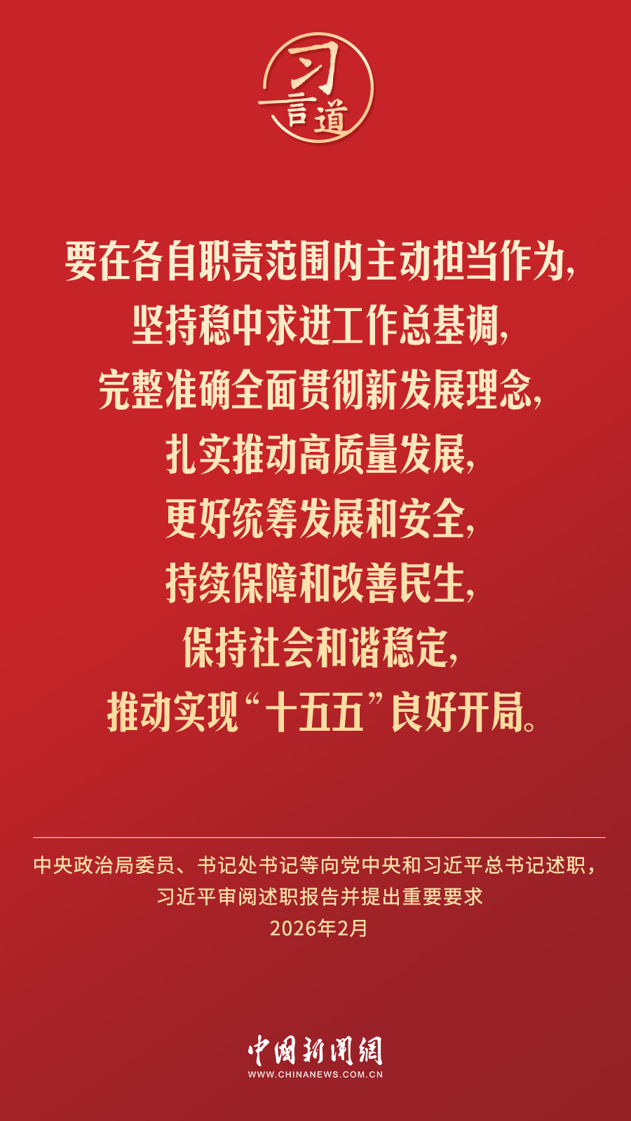 按照党中央有关规定,中央政治局委员、书记处书记,全国人大常委会、国务院、全国政协党组成员,最高人民法院、最高人民检察院党组书记近期就2025年度工作向党中央和习近平总书记书面述职。习近平审阅述职报告并提出重要要求。习近平强调——