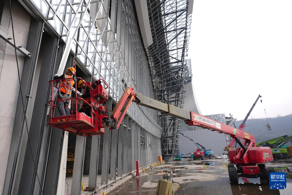 2月26日,工人对西安东站外立面进行幕墙安装作业。