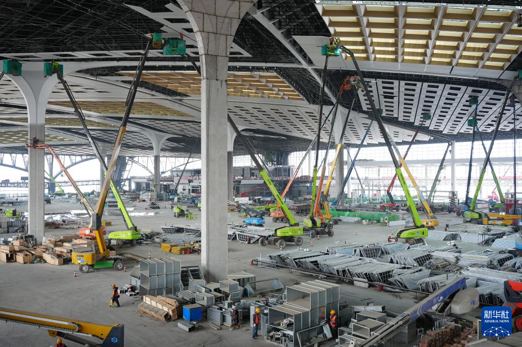 2月26日,工人在西安东站候车大厅内部进行吊顶安装。