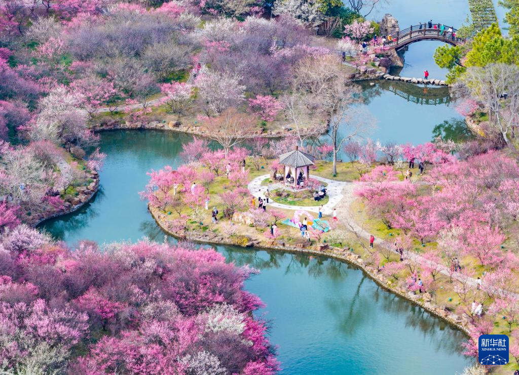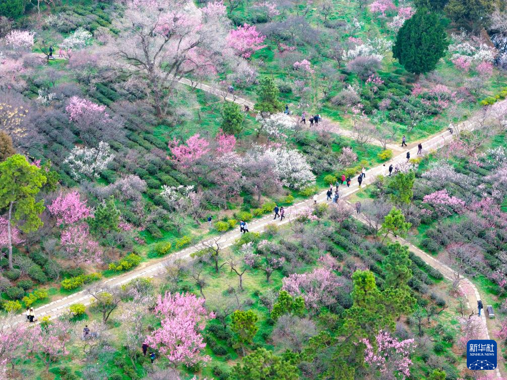 2月25日,游客在江苏南京明孝陵梅花山上赏梅踏春(无人机照片)。