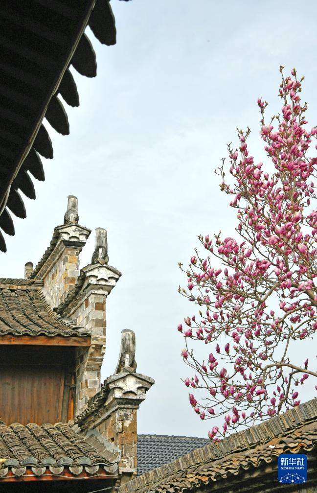 2月26日在浙江省台州市仙居县埠头镇西亚村拍摄的玉兰花和民居。