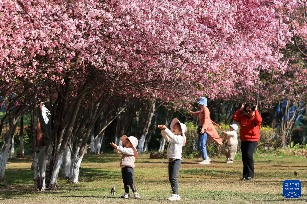 2月26日,游客在云南省曲靖市沾益区玉林广场海棠花树下赏景游玩。
