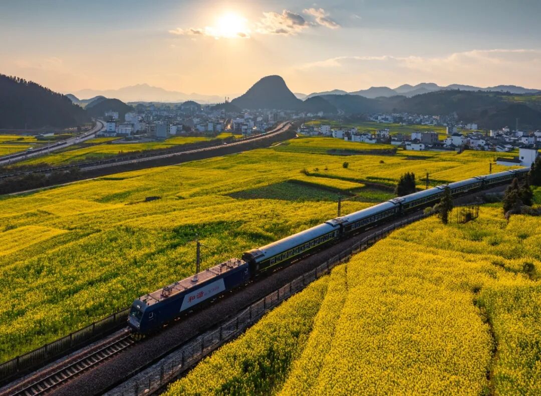 南昆铁路的春运旅途,被罗平的油菜花海温柔包围。暖阳下,列车如游龙穿梭在无边金浪里,花潮随春风起伏,晕染出层层柔光。远山含黛,村落隐在花影间,花香混着归乡的期盼,让每一段归途都盛满春日的浪漫与温暖。