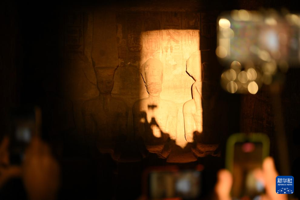 2月22日,在埃及南部阿斯旺省的阿布·辛拜勒神庙,游客拍摄被阳光照亮的雕像。