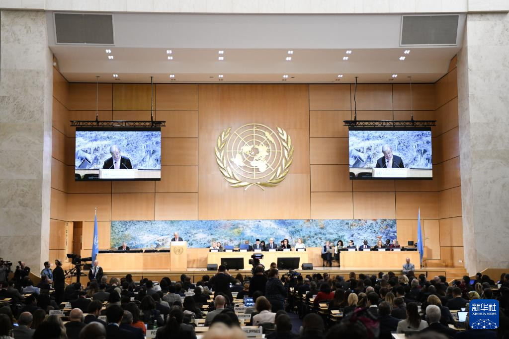 2月23日,在瑞士日内瓦万国宫,联合国秘书长古特雷斯在联合国人权理事会第61届会议上讲话。