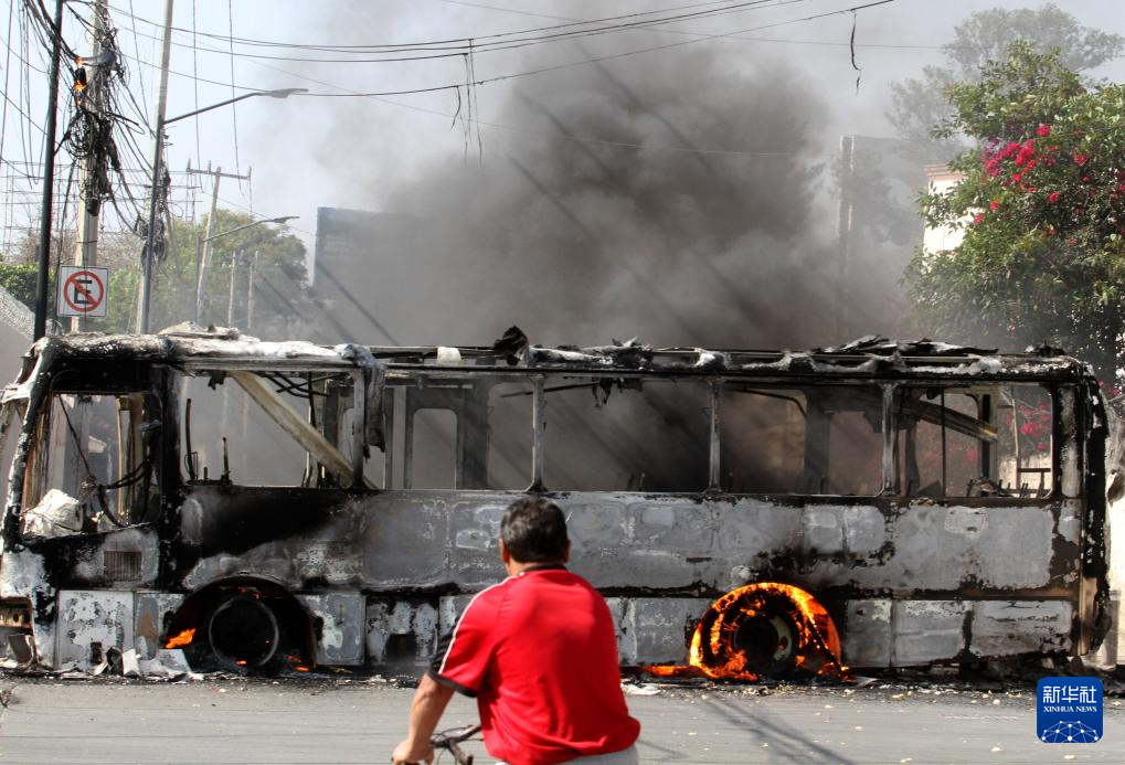 这是2月22日在墨西哥哈利斯科州首府瓜达拉哈拉拍摄的被焚烧的巴士。