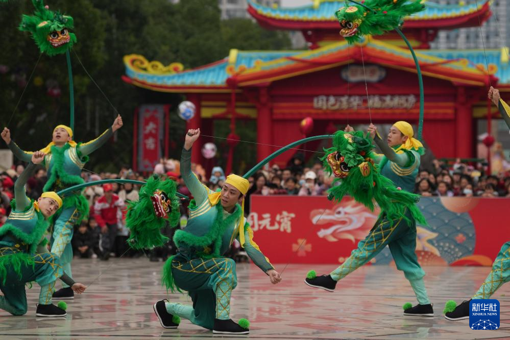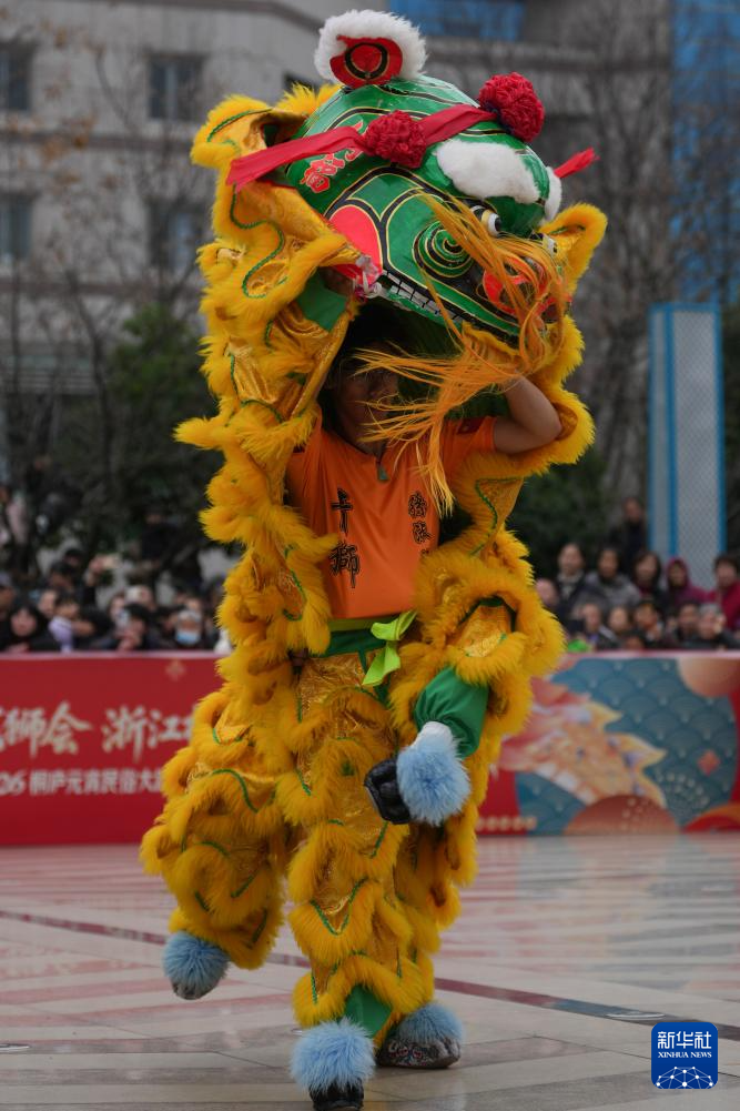 2月28日,广东揭阳青狮表演队在桐庐县中心广场巡游表演。