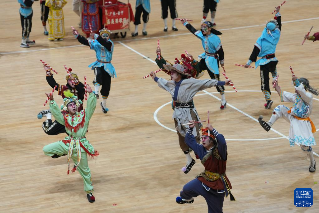 2月28日,来自广东潮汕地区的英歌舞表演队在江南体育馆表演。