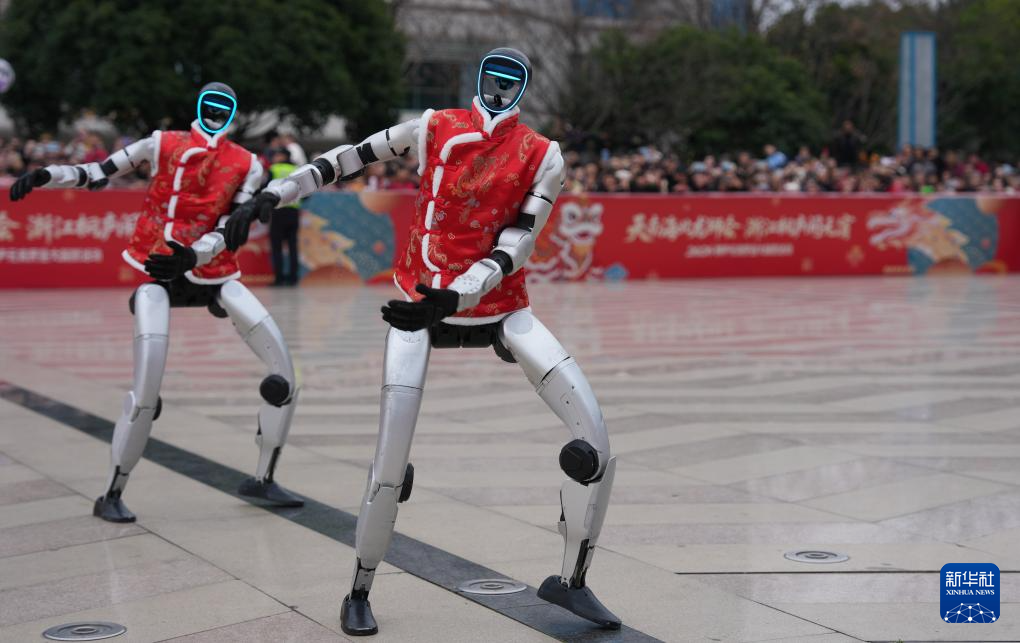 2月28日,宇树科技人形机器人在桐庐县中心广场表演舞蹈。