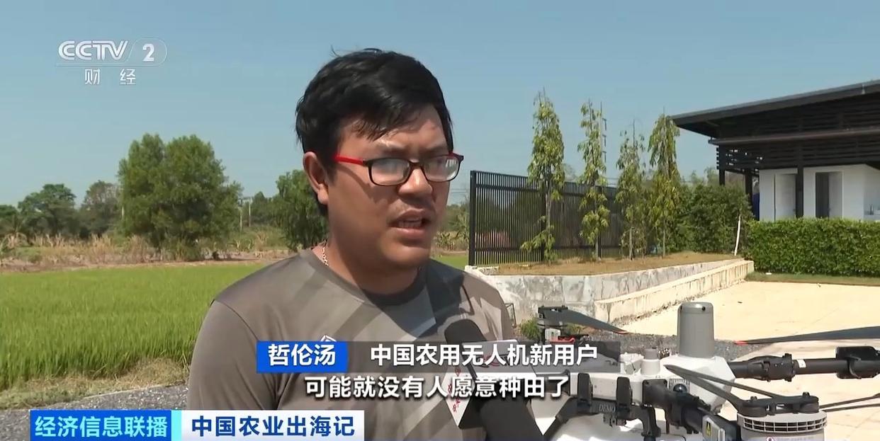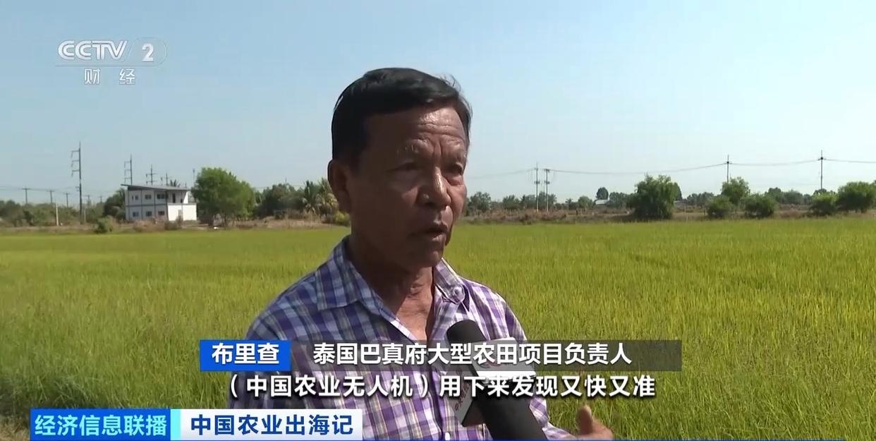 泰国巴真府大型农田项目负责人布里查:中国农业无人机用下来发现又快又准,而且不会漏喷,几乎是全面覆盖、喷得很细的方式。如果是人工的话,根本没办法知道喷药是不是均匀。