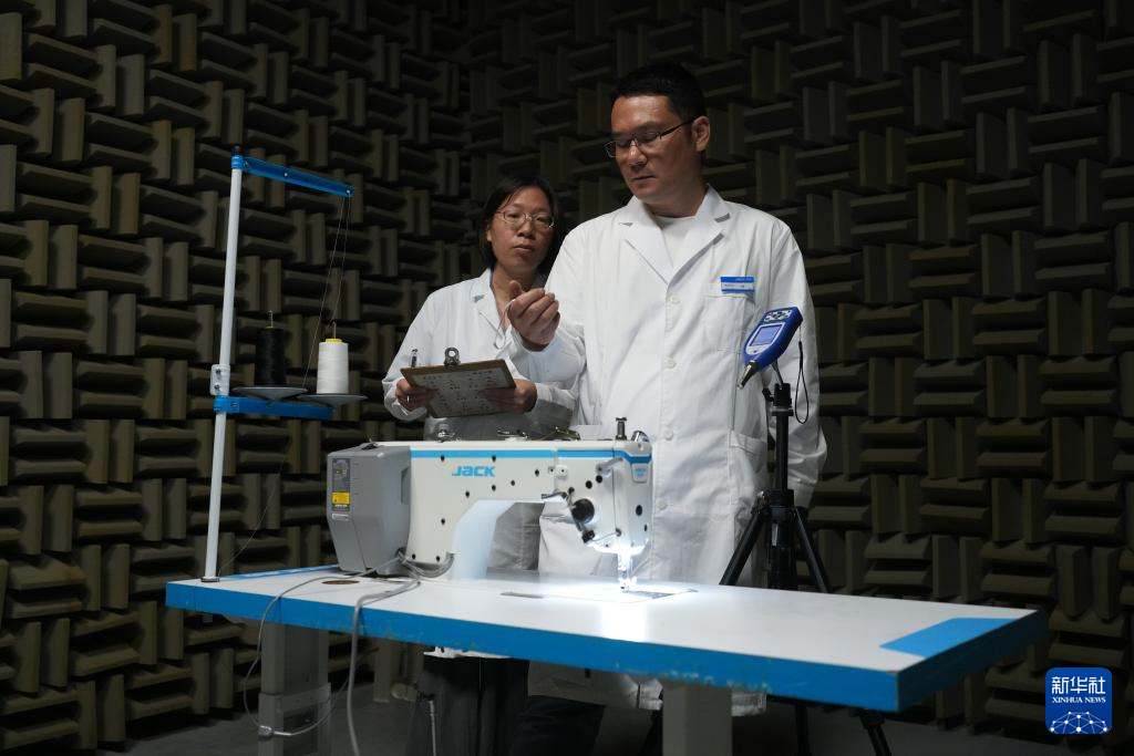 在位于浙江台州的杰克科技股份有限公司总部,实验室工程师在半消音室检测智能缝纫机噪声(2025年7月17日摄)。位于浙江台州的杰克科技股份有限公司是一个从家用缝制设备起家的民营企业,通过不断的科技创新、专利积累、国际化并购等,成为全球智能化服装装备行业的领军者。