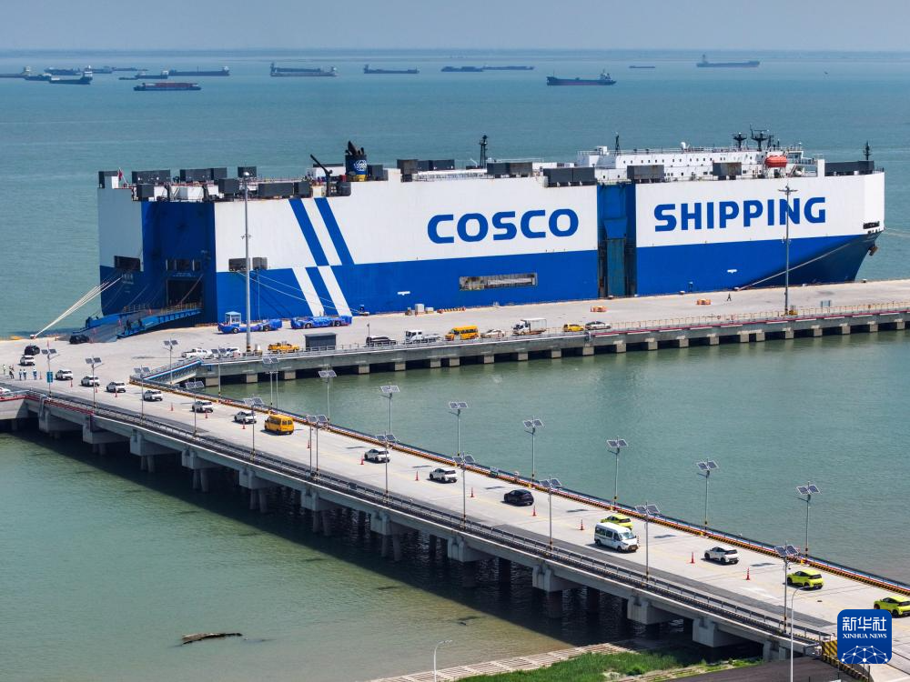 2025年9月16日,在江苏太仓港,装载3600余辆商品车的“玉衡先锋”号即将启程前往东南亚(无人机照片)。