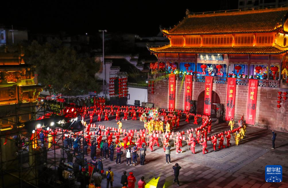 2月28日,在安徽省黄山市休宁县状元广场,非遗民俗徽州板凳龙在夜色中巡游。