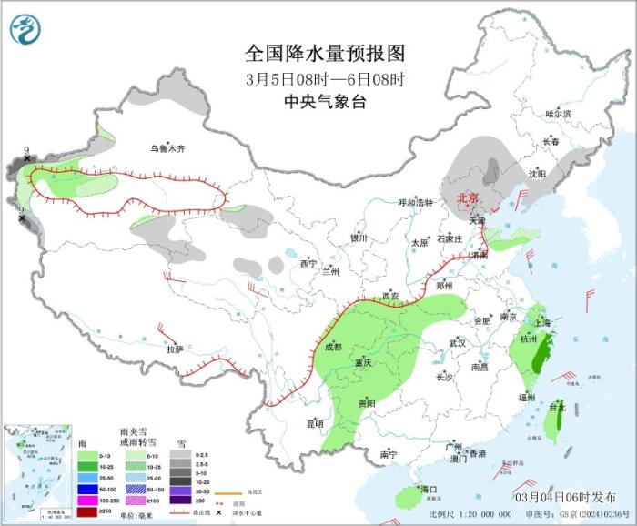 3月5日08时至6日08时,内蒙古中部、吉林东部、辽宁西部和南部、新疆南疆西部山区和北部、青海北部和西部、甘肃河西、河北北部、北京、天津、山东北部等地部分地区有小雪或雨夹雪,其中,内蒙古东南部、新疆南疆西部山区等地部分地区有中到大雪(5~9毫米)。新疆南疆盆地、陕西南部、河南南部、湖北西部、上海、浙江、福建东北部、四川盆地、重庆、贵州大部、云南东南部、海南岛、台湾岛等地部分地区有小雨,局地有中雨。西藏西部、青海南部和西部、甘肃河西、内蒙古中部和西部、山西、陕西北部等地部分地区有4~6级风、阵风7~8级;渤海、渤海海峡、黄海中北部海域、东海大部海域、台湾海峡、南海北部和中西部海域、巴士海峡将有4~6级风、阵风7级。