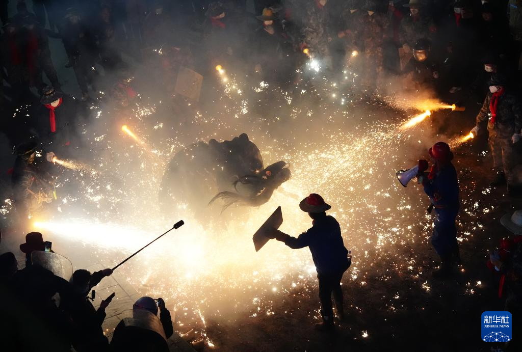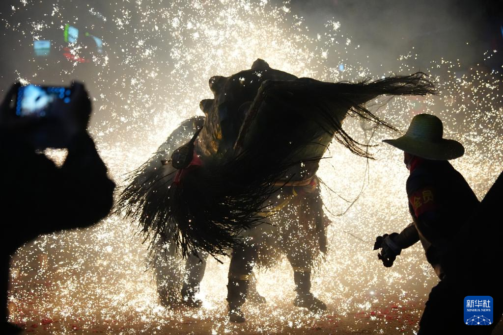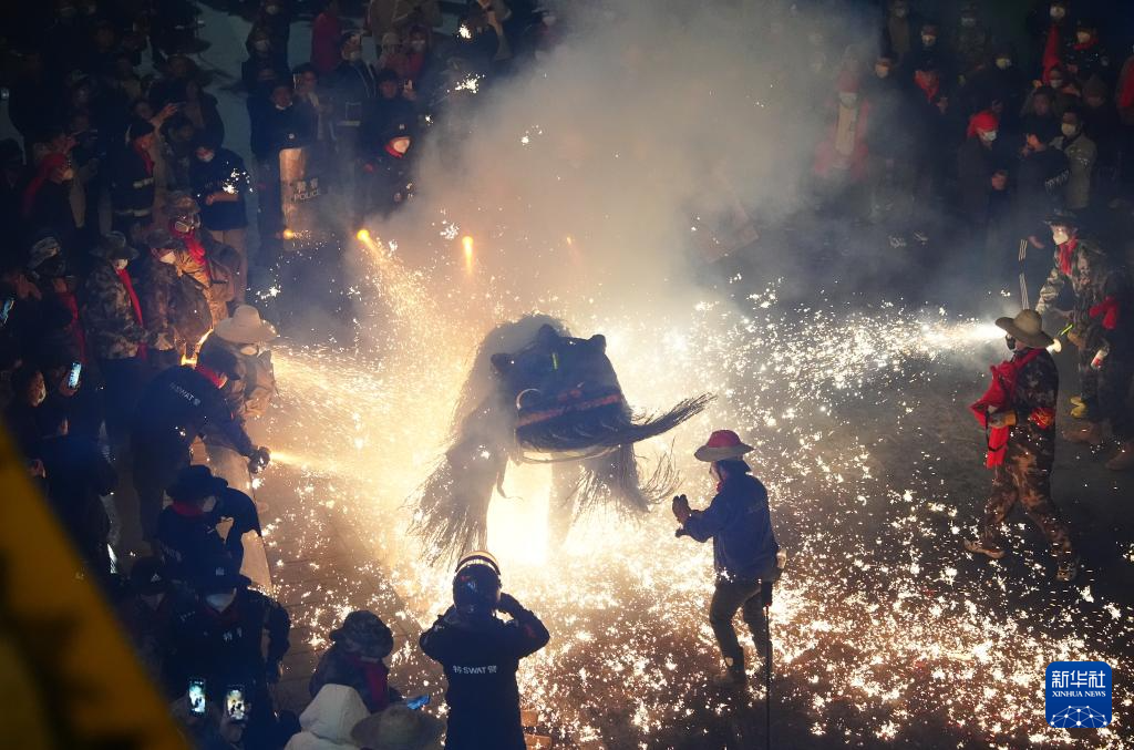 3月2日,在陕西旬阳市蜀河镇蜀河社区,表演人员在用烟花“烧狮子”。