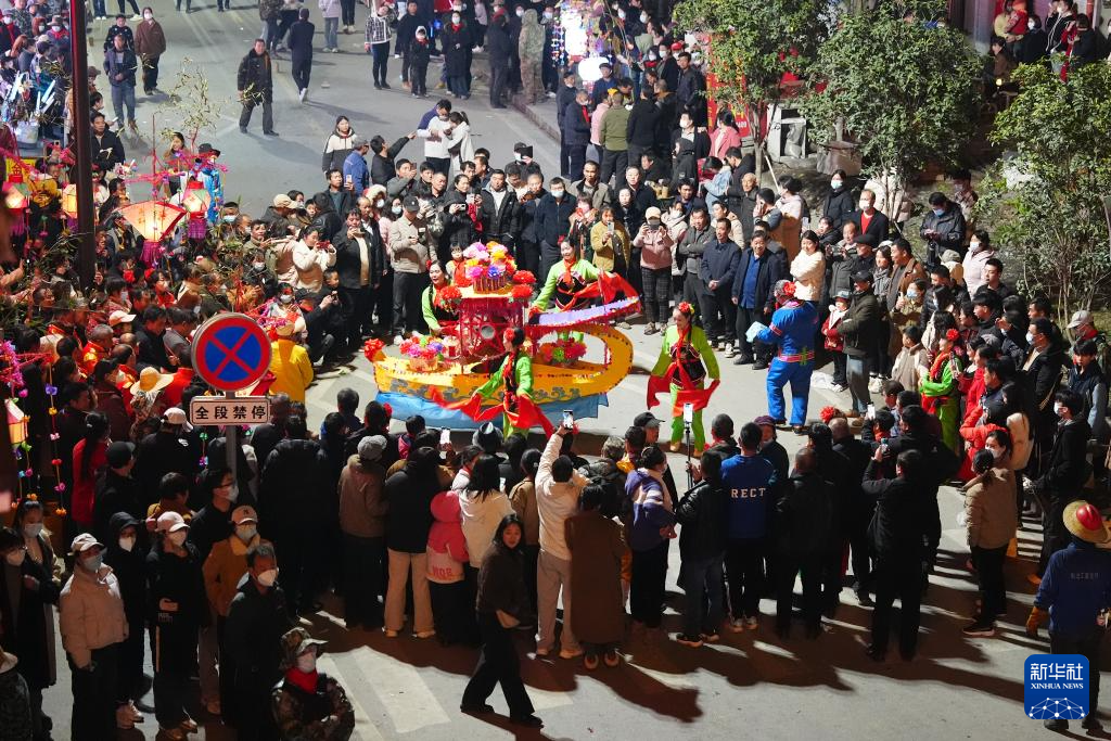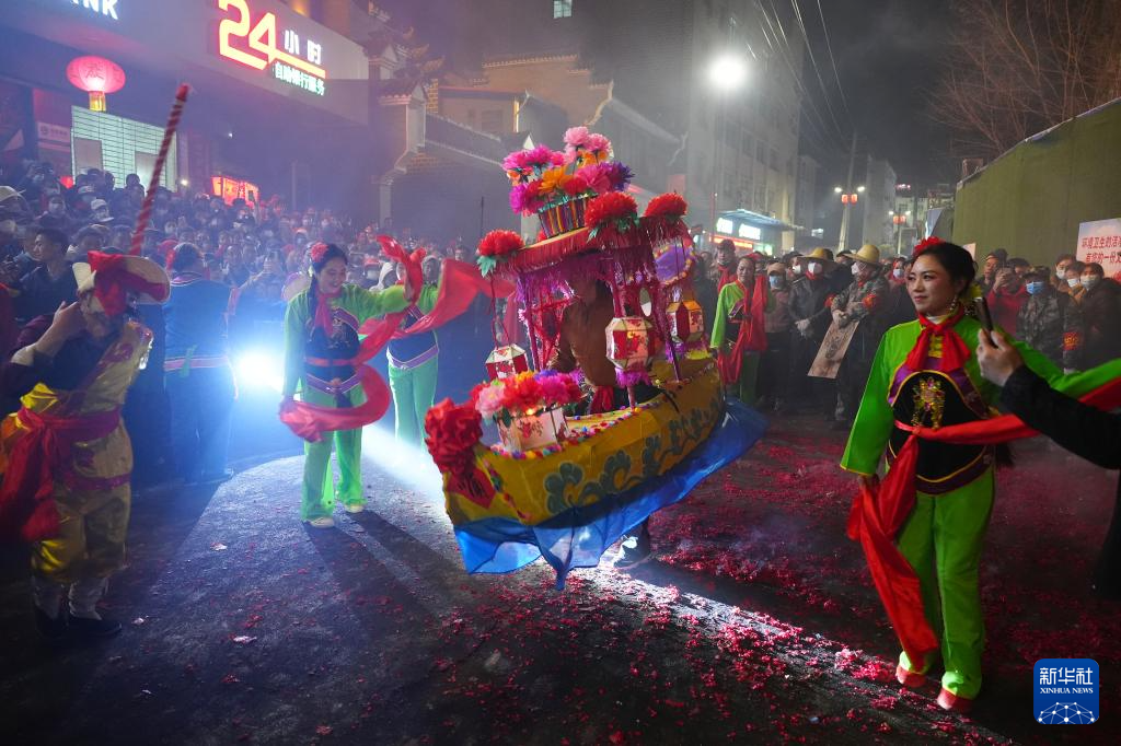 3月2日,在陕西旬阳市蜀河镇蜀河社区,表演人员在“烧狮子”间歇时表演划彩莲船。