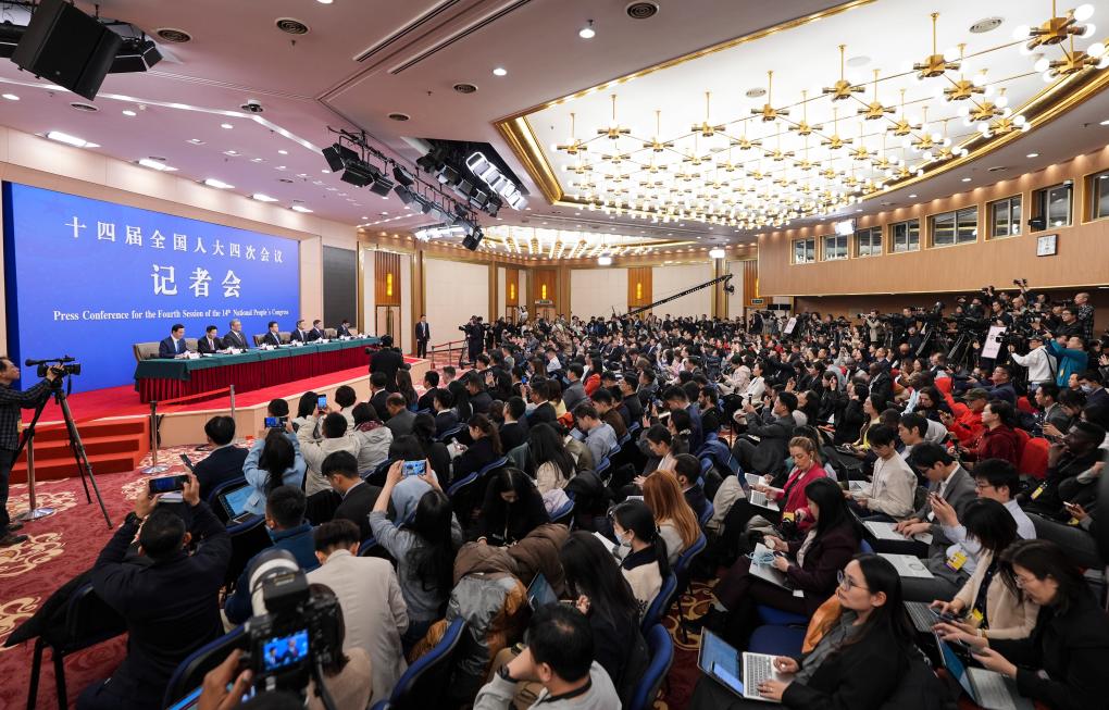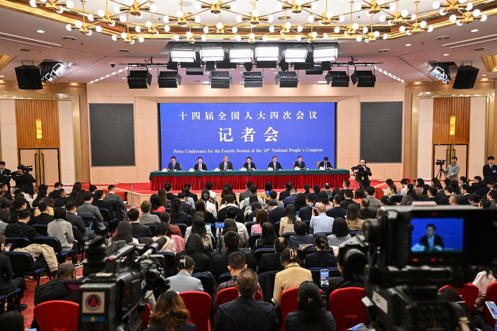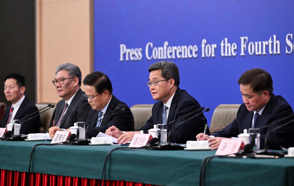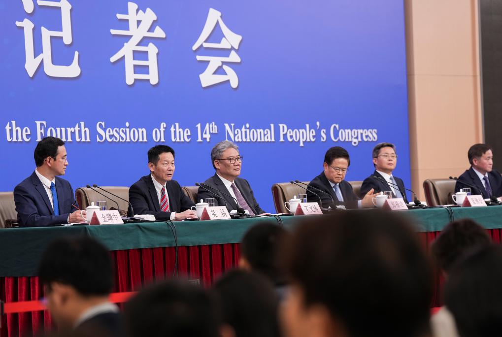 3月6日,十四届全国人大四次会议在北京梅地亚中心新闻发布厅举行记者会。国家发展和改革委员会主任郑栅洁、财政部部长蓝佛安、商务部部长王文涛、中国人民银行行长潘功胜、中国证券监督管理委员会主席吴清就发展改革、财政预算、商务、金融证券等相关问题回答中外记者提问。