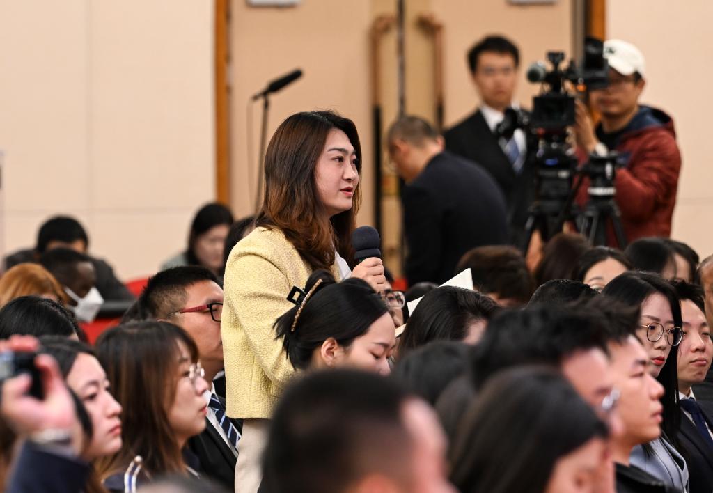 3月6日,十四届全国人大四次会议在北京梅地亚中心新闻发布厅举行记者会。国家发展和改革委员会主任郑栅洁、财政部部长蓝佛安、商务部部长王文涛、中国人民银行行长潘功胜、中国证券监督管理委员会主席吴清就发展改革、财政预算、商务、金融证券等相关问题回答中外记者提问。这是记者在提问。